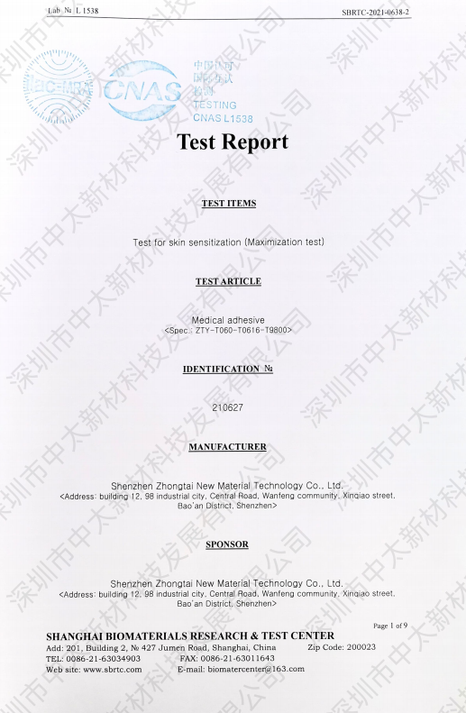 Это отчет о тестировании раздражающего действия на коже медицинского клея (Спецификация: ZTY-T060-T0616-T9800) компании Shenzhen Zhongtai New Material Technology Co., Ltd. Исследование проведено Шанхайским центром исследований и испытаний биоматериалов в соответствии со стандартом ISO 10993. В ходе теста максимизации у морских свинок использовали два вида экстрактов. Через 24 и 48 часов после теста сенсибилизирующих реакций не наблюдалось, что подтверждает высокую безопасность продукта для кожи и отсутствие риска сенсибилизации.